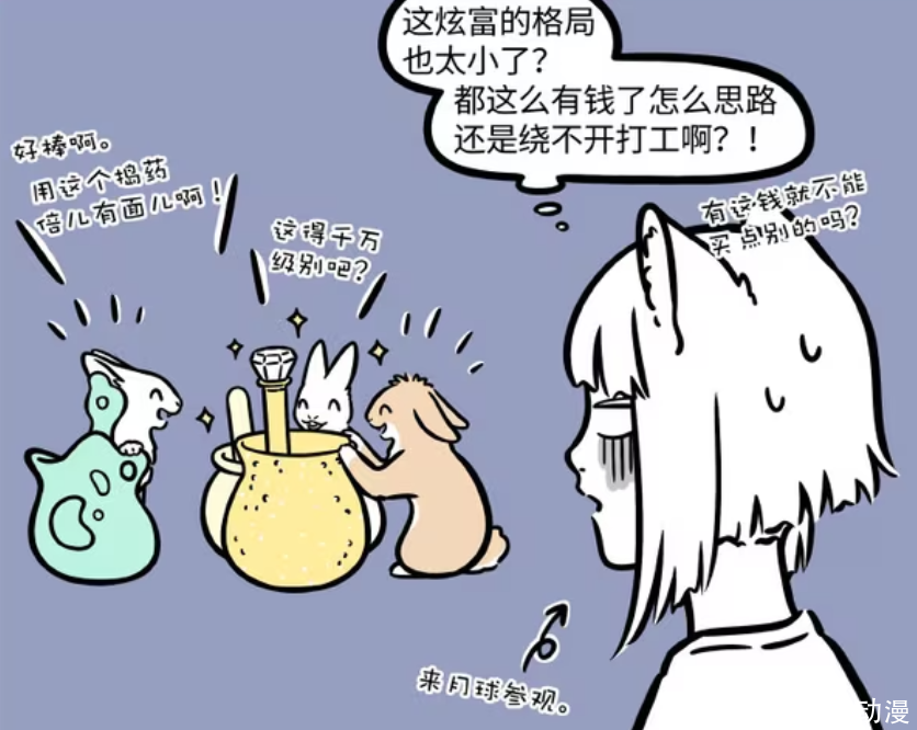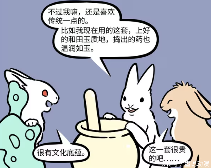 玉兔们在月球生活了很多年,加上现在科技发达以及自身法力比较高,它们都能往返于地球。前阵子杨戬还挖了不少玉兔去动物咖啡厅,这一次并没有挖人情况。不过玉兔们也有新的活动,那就是比较谁的杵臼更高端。其中一只玉兔表示自己的杵臼很前卫,是知名设计师jade Rabbit的新作。看起来倒是有点艺术感,或许价格也不便宜。