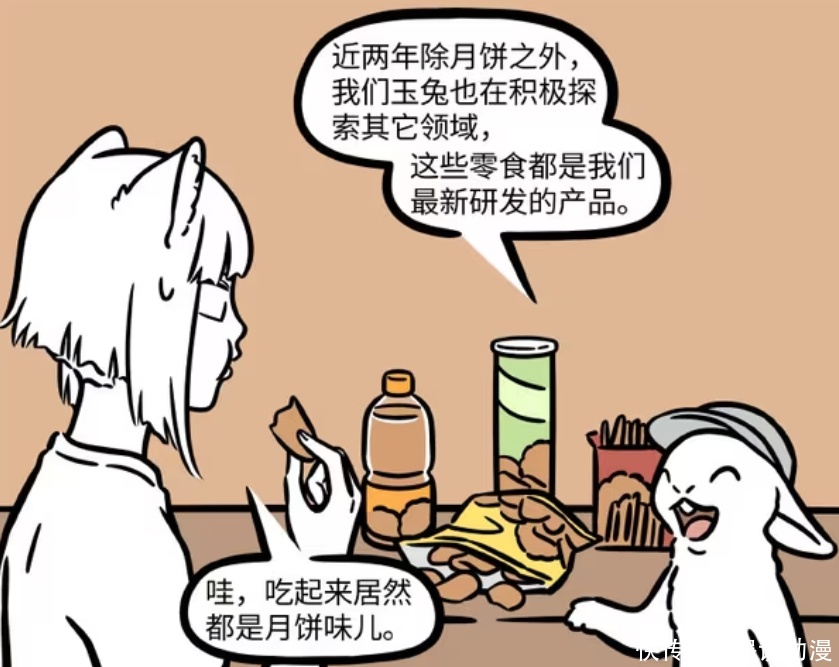 近两年,月球除了产出月饼之外,玉兔们也在积极开发新产品,探索全新的领域。比如零食就是他们新品研发的重点,饮料、薯片、薯条等等零食被研发出来,不过味道上,还都是月饼味。这样一来,不就跟吃月饼差不多?